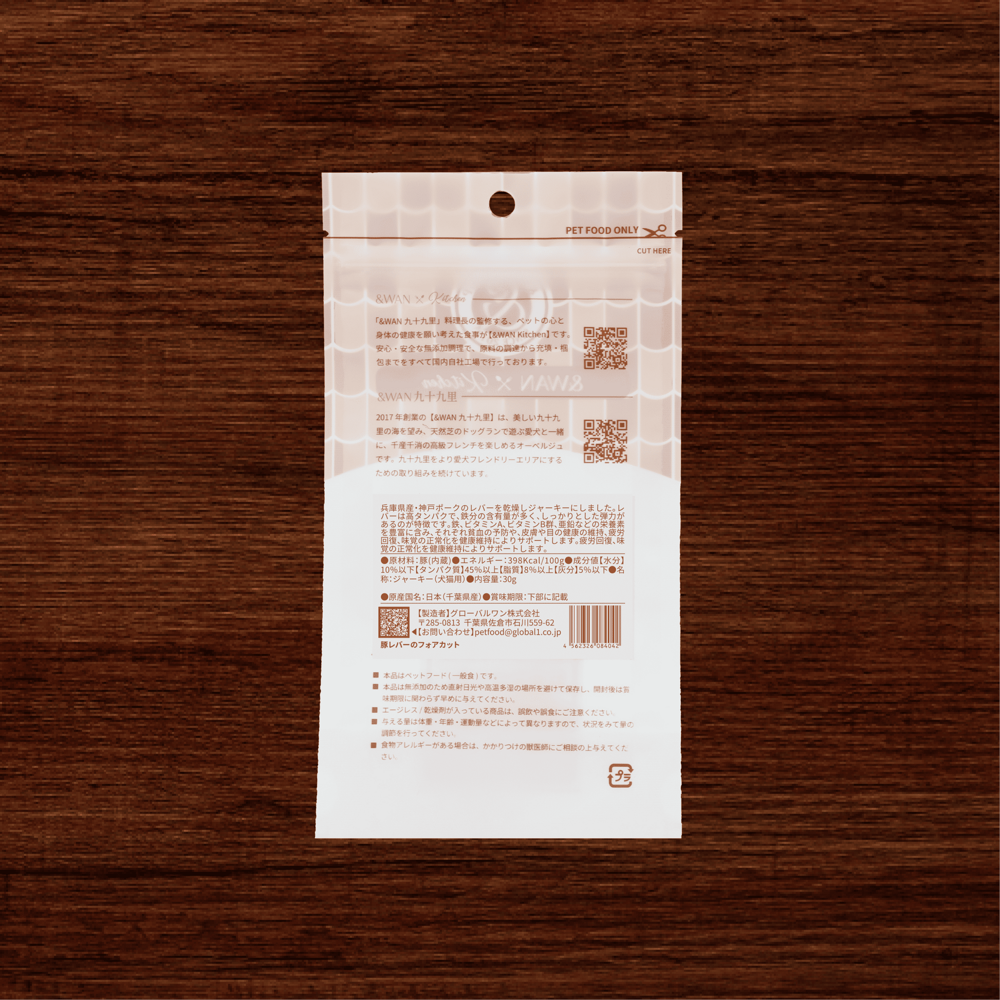 原材料 : 豚(内臓)●エネルギー:398Kcal/100g●成分値【水分】10%以下【タンパク質】45%以上【脂質】8%以上【灰分】5%以下●名称ジャーキー(犬猫用)●内容量:30g●原産国名:日本(千葉県産)