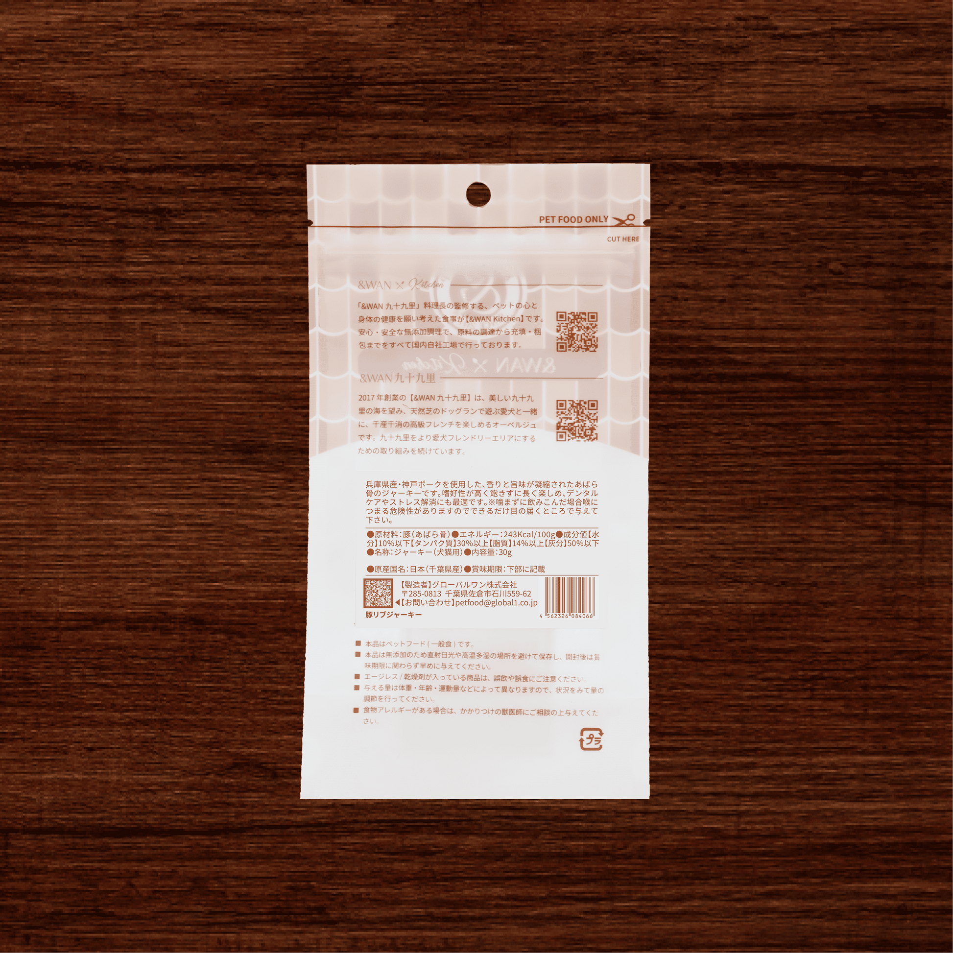 原材料 : 豚(あばら骨)●エネルギー:243Kcal/100g●成分値【水分】10%以下【タンパク質】30%以上【脂質】14%以上【灰分】50%以下●名称ジャーキー(犬猫用)●内容量:30g●原産国名:日本(千葉県産)