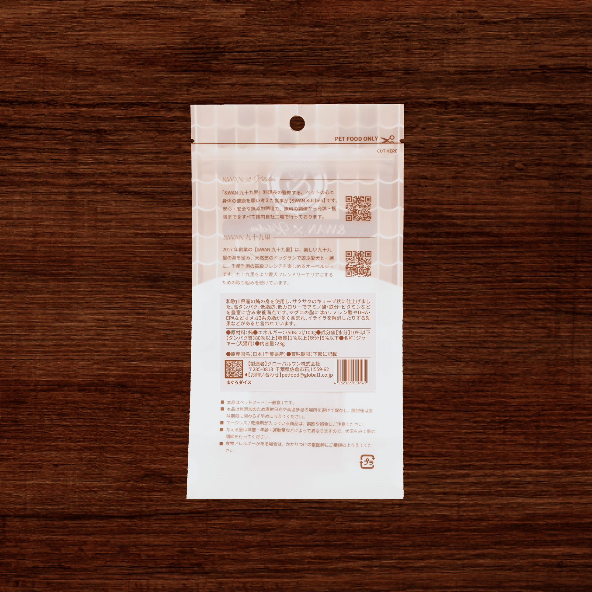 和歌山県産のまぐろの身を使用し、サクサクのキューブ上に仕上げました。高たんぱく、低脂肪、低カロリーでアミノ酸・鉄分・ビタミンなどを豊富に含み栄養満点です。マグロの脂にはαリノレン酸やDHA・EPAなどオメガ3系の油が多く含まれ、イライラを解消したりする効果などがあると言われています。